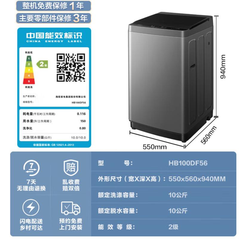 海信/Hisense 波轮洗衣机全自动大容量除螨洗桶自洁 10公斤 HB100DF56 二级能效