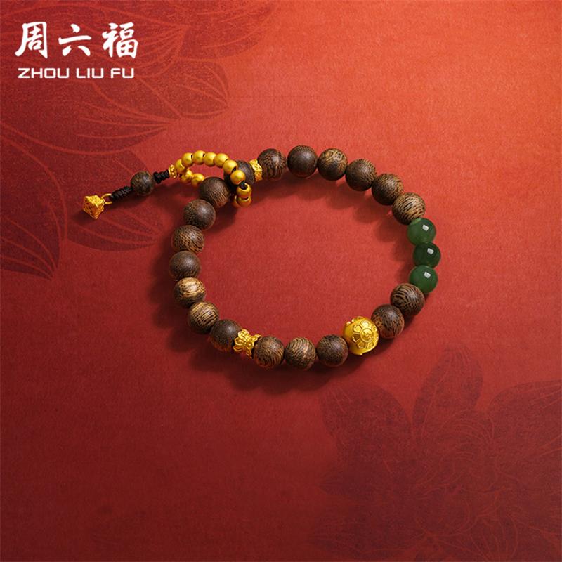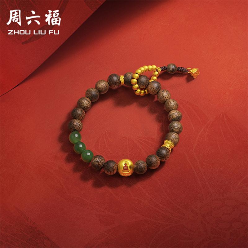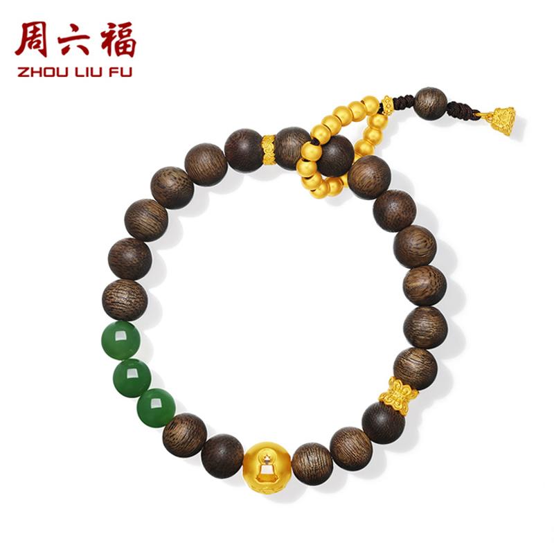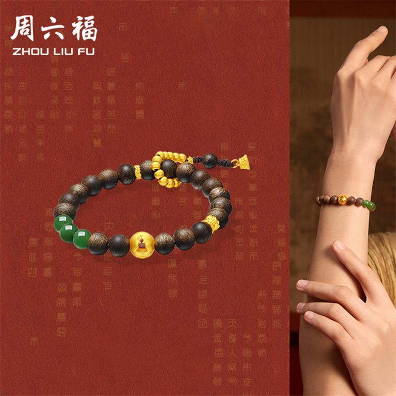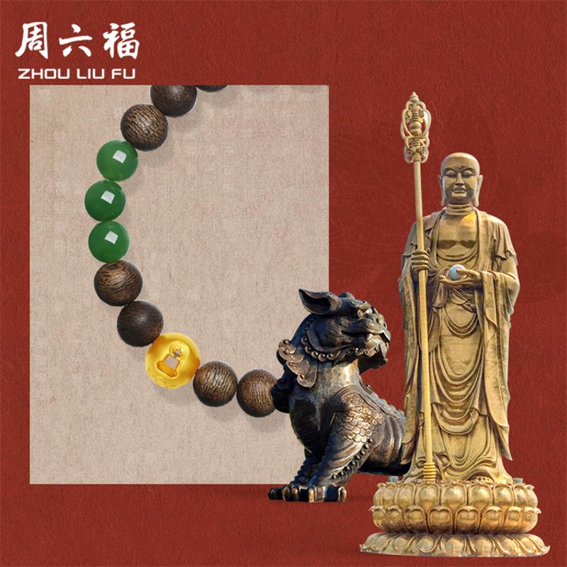 周六福 黄金5D硬金和田碧玉金佛遇莲金镶玉手串九华山节日礼物