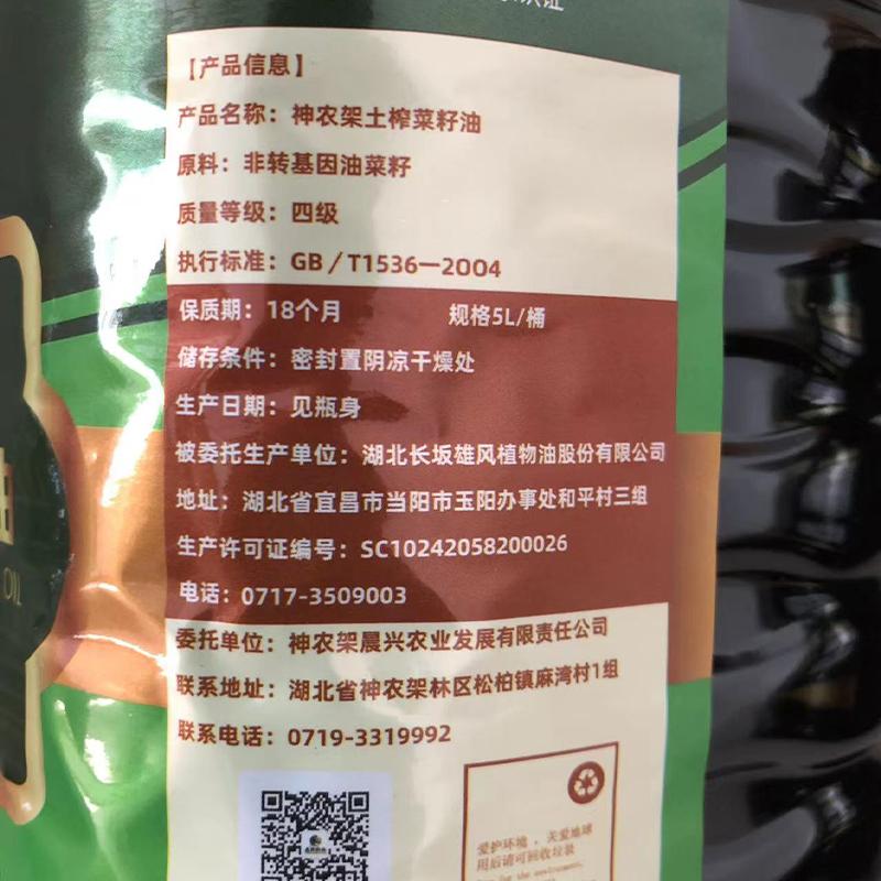 原材铺 神农架土榨菜籽油 5L